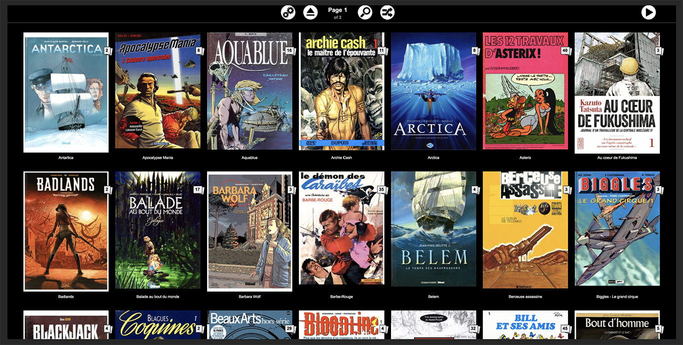 La différence ici est qu’il y a les couvertures des BD. Par contre, je n’ai pas réussi à lui demander de le lire en affichage de 2 pages côte à côte (Acrobat Reader fait ça facilement), c’est dommage (d’autant que ça se lit comme ça une BD, et que j’ai un assez grand écran). Bref, question ergonomie on a vu mieux et je reste sur ma faim…